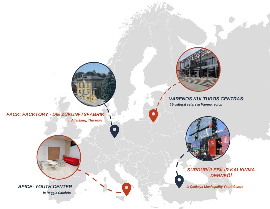 From a youth-led center in a German rural region to Lithuanian cultural centers in a sparsely populated area, a Turkish municipal youth centre in a neighborhood with a mixed demographic, and an Italian center in a property confiscated from the mafia , each site offers unique learning opportunities.